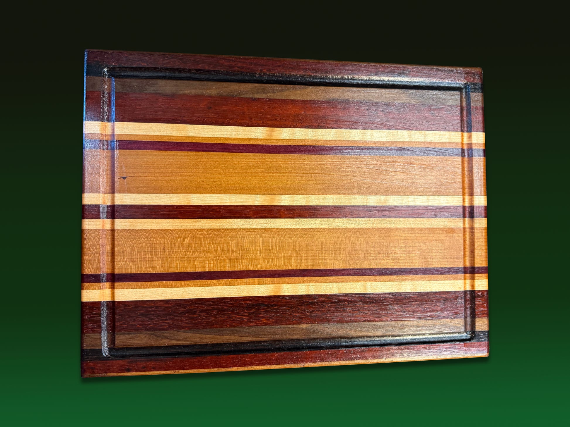 Handcrafted from domestic and exotic hardwoods, this premium cutting board combines functionality with heirloom quality. Juice grooves channel liquids away from your work surface, while beveled edges provide a comfortable grip and refined aesthetic. Rubber feet keep the board stable during use and protect your countertops. Built to last generations, it makes a thoughtful gift for chefs, newlyweds, and anyone who appreciates artisan craftsmanship. A cutting board worthy of passing down.