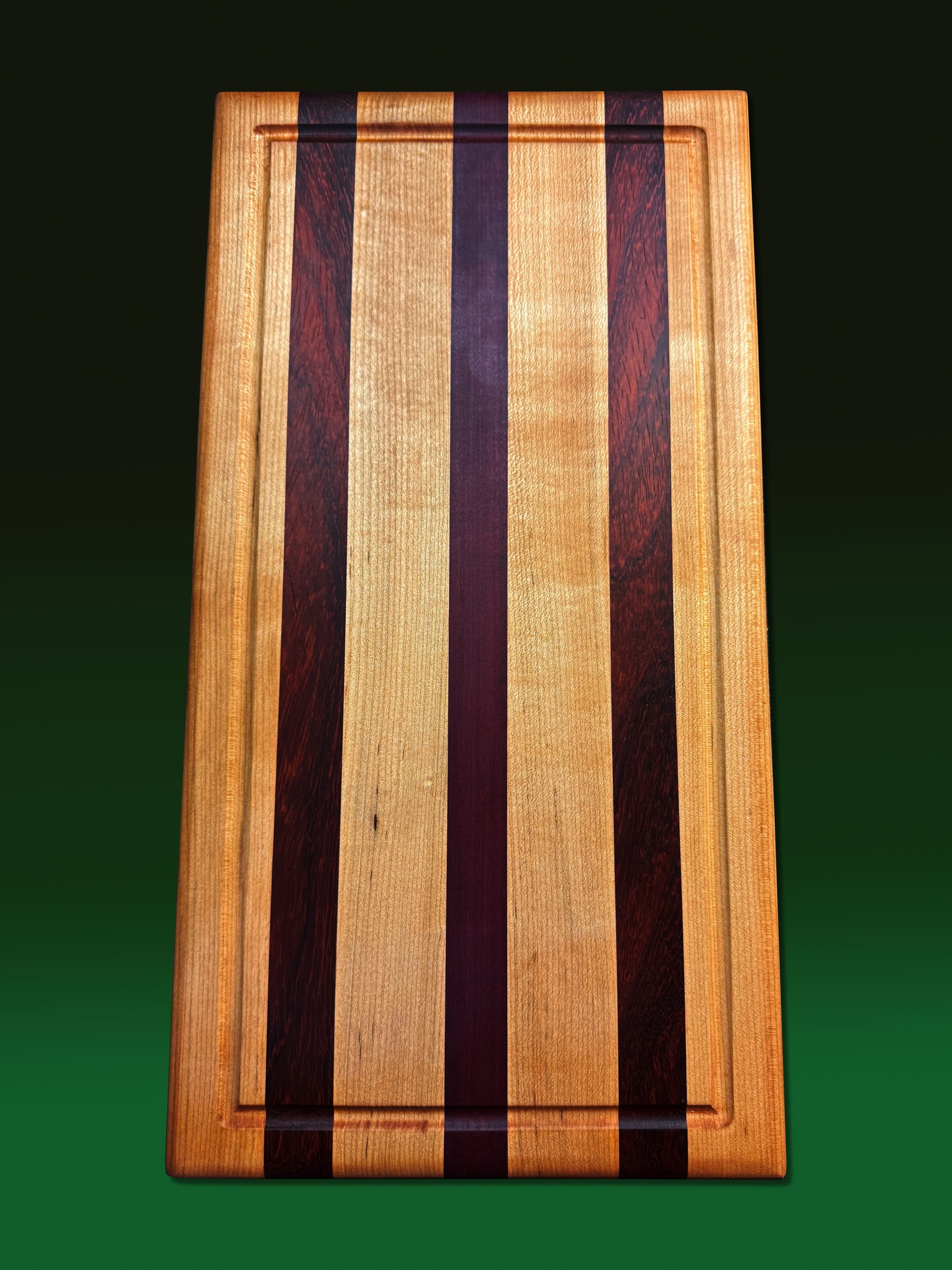 Handcrafted from domestic and exotic hardwoods, this premium cutting board combines functionality with heirloom quality. Juice grooves channel liquids away from your work surface, while beveled edges provide a comfortable grip and refined aesthetic. Rubber feet keep the board stable during use and protect your countertops. Built to last generations, it makes a thoughtful gift for chefs, newlyweds, and anyone who appreciates artisan craftsmanship. A cutting board worthy of passing down.
